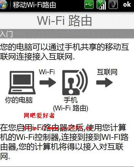 这是WM.WiFi Router 外的另一款免费的无线路由器软件,可以把WM手机变为无线路由器,从而电脑可以通过WiFi 连接,使用手机网络上网。支持WEP加密协议。