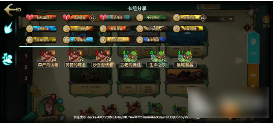 卡组组成:战术清理、源源不断X2、苟延残喘、争分夺秒、麻痹药剂X2、地质样本、无中生有、黄金傀偶、妙计连连、能量回收、能量宝石、科技精华、金能护盾、未来收益;森严的山寨X2、贪梦的炼金X2、沙丘潜伏者X2、古老的神灯、生命之泉X2、黑曜魔晶。