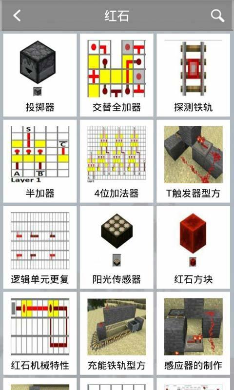 1.合成表:包含了所有的关于该游戏的物品合成的方法。更有子分类:基本合成、方块合成、防具合成、道具合成、食物合成、染料合成、物品合成、炼金合成、红石合成和其他合成。