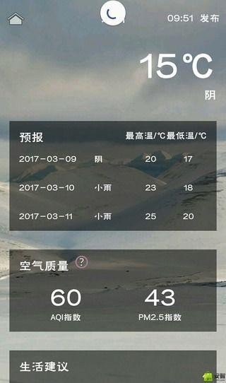 溜溜天气app这是一款查询天气的手机应用,包含了全国县级及县级以上地区的天气查询,手动更新和后台自动更新功能。其中包括未来几天的天气情况,空气指数及生活建议模块,每天自动切换背景图。非常简单实用!