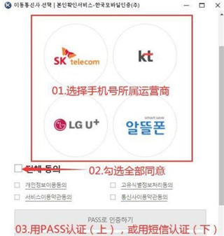 点击手机验证后会弹出新的窗口,需要我们选择自己的手机运营商,同意条款,然后选择认证方式。PASS 认证需要下载APP比较麻烦,这里推荐使用短信认证,就是下面的选项。