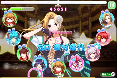 有系统提供众多歌曲可供选择演奏,歌曲随等级提升或VIP特权解锁,每首歌曲均分为由简到难三个级别,歌曲有特定属性,与卡牌三围属性对应,歌曲得分只与和歌曲属性相同的队伍卡牌属性值有关,选择助阵好友可提升队伍属性。