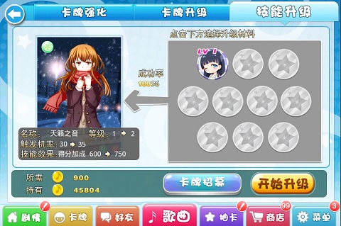 技能升级:利用相同技能卡牌或者技能卡为主卡进行技能升级,来提升技能的触发概率和触发效果,技能升级一定几率成功。