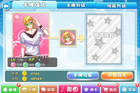 卡牌的养成主要分为卡牌升级、卡牌强化、技能升级。