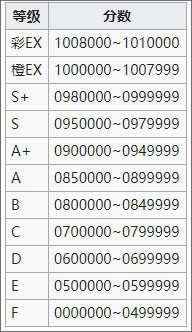 1、各谱面满分为1010000分,以Perfect判定为基准,各判定赋分比例为: