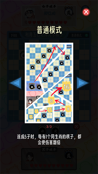 4、连成5子时,每有1个同生肖的棋子都会使伤害翻倍