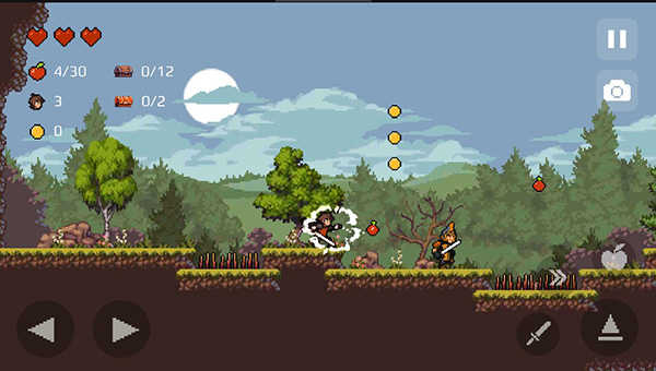5、点击右下角的向上箭头可以跳跃,连续点击两次跳得更高。收集到的苹果和金币会在左上角显示,必须收集齐所有物品才能完美通关。