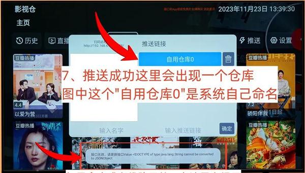 安装完TVBox、影视仓等应用后,启动影视仓,进入设置菜单,电视屏幕上会显示一个包含二维码的配置页面。