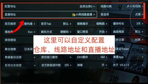 在影视仓的设置里面可以进行自定义设置,包括单独配置直播地址和线路地址,若无需要,保持默认设置即可。