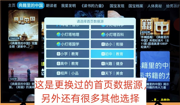 这个时候要按电视遥控器上的菜单键(就是三条横杠的那个按键),然后会弹出“请选择首页数据源”的窗口。更换数据源之后,可以看到主页界面已经变了,不同线路的数据源都不同,根据需要自己选择。