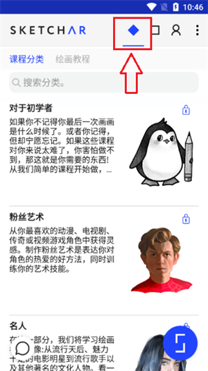 下载安装Sketchar最新版,运行软件,之后点击上方红框中的图标进入“学校”专区;