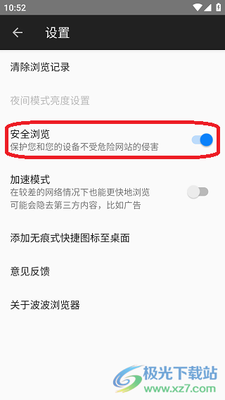 3、来到设置页面,这里显示安全浏览,只要滑动关闭就可解除禁止访问啦。