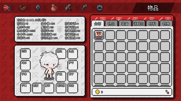 在物品栏当中,玩家可以给角色装备上各种类型的武器装备;