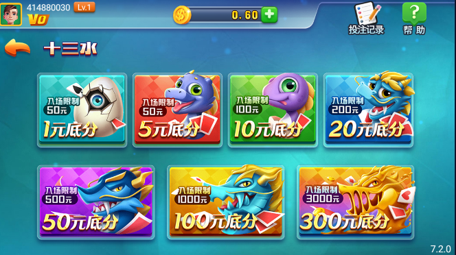 玩家进入到游戏之后选择【十三水】,一共拥有7个房间。