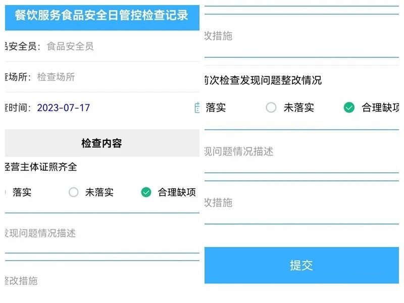 填写“日管控”信息后提交。食品安全员填写从业人员姓名,检查场所填写店名