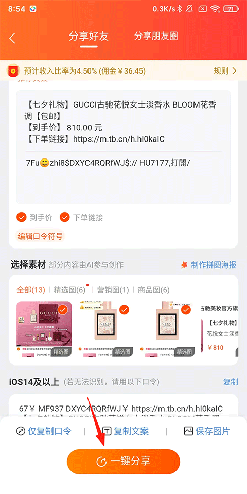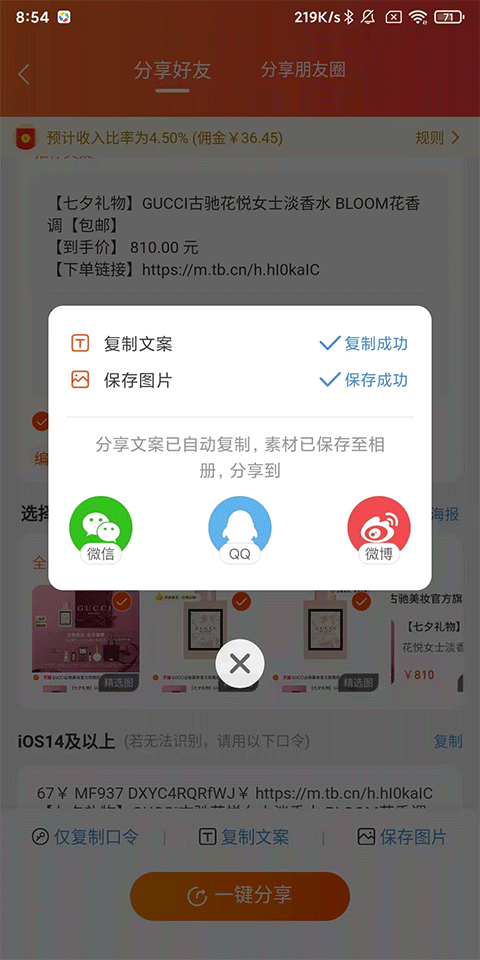 可选择【仅复制口令】、【复制文案】、【保存图片】及【一键分享】;