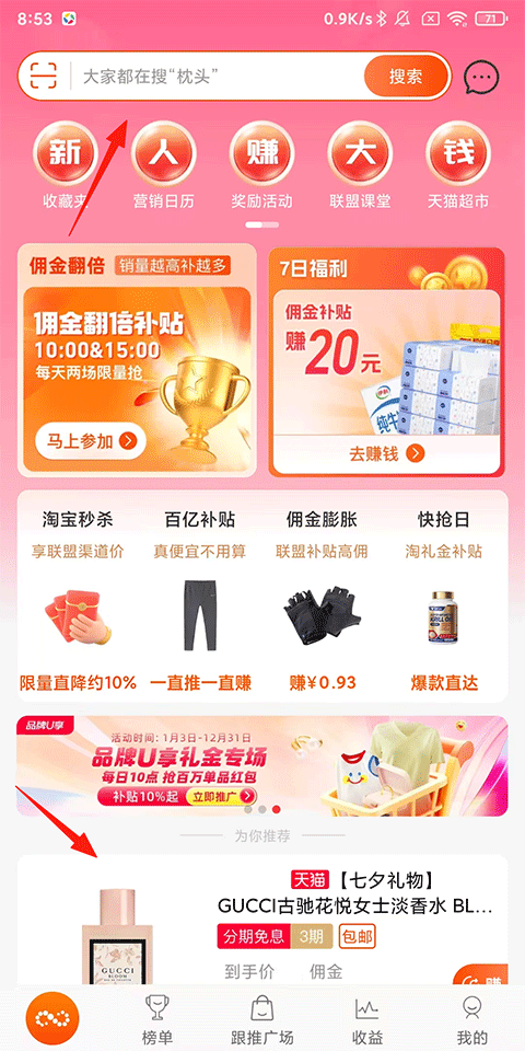 打开淘宝联盟APP,在首页搜索栏搜索或在下方挑选合适的商品进行推广;