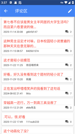 每本小说都内置评论区,读者可以查看大家对剧情、角色、题材以及动画化可能性的讨论,同时也能发表自己的观点,与其他轻小说爱好者互动交流。