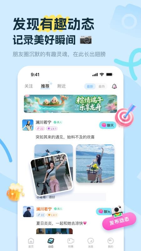 饭友交友app主要为用户提供了同城附近交友,帮助用户趣味交友,实时进行陪聊娱乐,轻松或者在线的优质陪伴,让你与好友来实时聊天互动,实现语音视频的聊天,轻松进行视频特惠聊天,快速接通,以便可以结交更多的好友;而且用户也可以分享生活点滴,趣味分享生活。