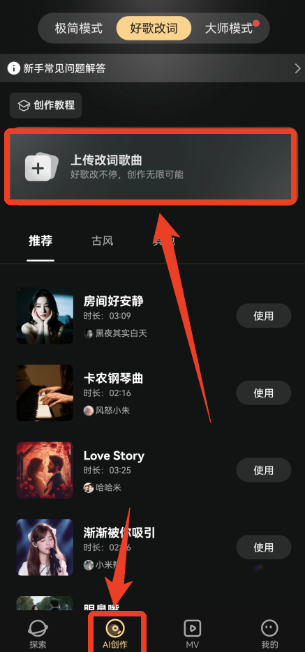首先我们来到【AI创作】,点击上方的【好歌改词】。大家可以在下方选择歌曲或者自己上传。