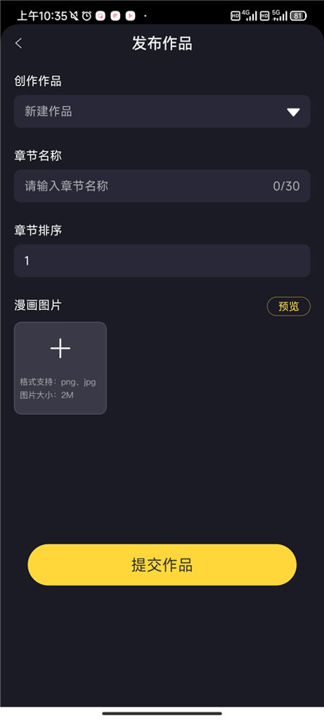 输入作品名称、漫画类型、漫画封面、简介等相关信息。