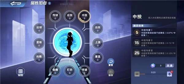 在属性加点系统中,球员的每一个属性最多只能加到25点,并且一个角色的总属性加点不能超过100点,玩家需要更加合理地分配属性点。每次球员的属性点增加到5/15/25点后还会激活对应的加点技能,提升球员的实力,但仅对当前球员生效。