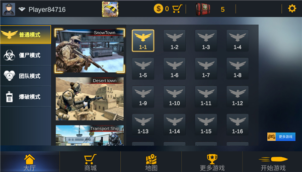 在地图选择各种模式,其中有普通模式、僵尸模式、团队模式以及爆破模式四种玩法供玩家选择。