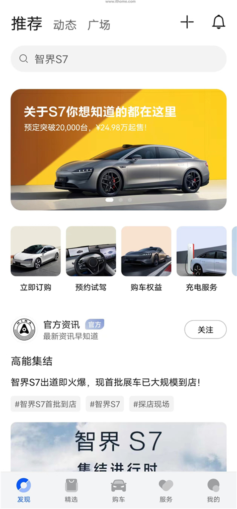 汇集了官方资讯、订车购车、智能车控、充电服务、精选购物等内容