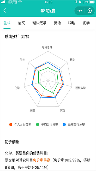 直观的显示出个人的得分率与整体的对比情况,并根据个人的成绩初步诊断学生的各科情况: