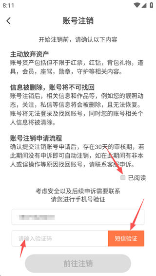 勾选已阅读,点击“短信验证”,收到验证码之后填写进去,然后点击“前往注销”按钮进行注销即可。