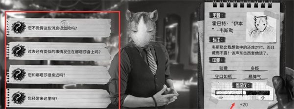 点击盘问之后,可以问各种问题,然后根据侦探仪判断对方有没有说谎