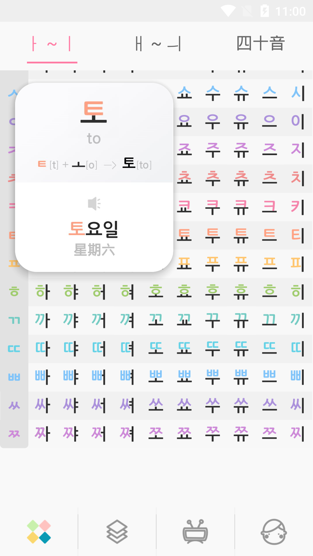 -包含480个韩语字母,点击每个字母都可以发音,每个常用韩语字母都包含单词例子以及纯正发音