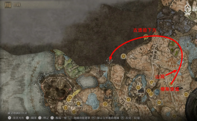 西北方向的地图想要解锁需要跑地下路线,首先从赐福「穆斯废墟」出发,在下图有玛莉卡雕像的位置(第二张图)进入山洞,接着来到有很多石像鸟的地方。继续来到赐福「古遗迹下方」,这里是主线后期「劳弗古遗迹」的地底区域,和主线没关系,但是地图需要在这里解锁 —— 打开地图就能看到信标的位置,之前前往可以拿到「地图碎片:劳弗古遗迹」。