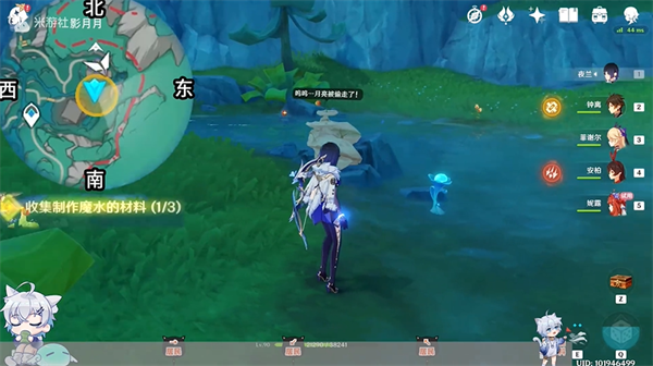 14、对话结束后,跳到下方拾取水边的金鱼草、日落果、月莲,拾取完成后,返回赐福小屋即可。月莲前有蕈兽,可以不打捡完直接走。