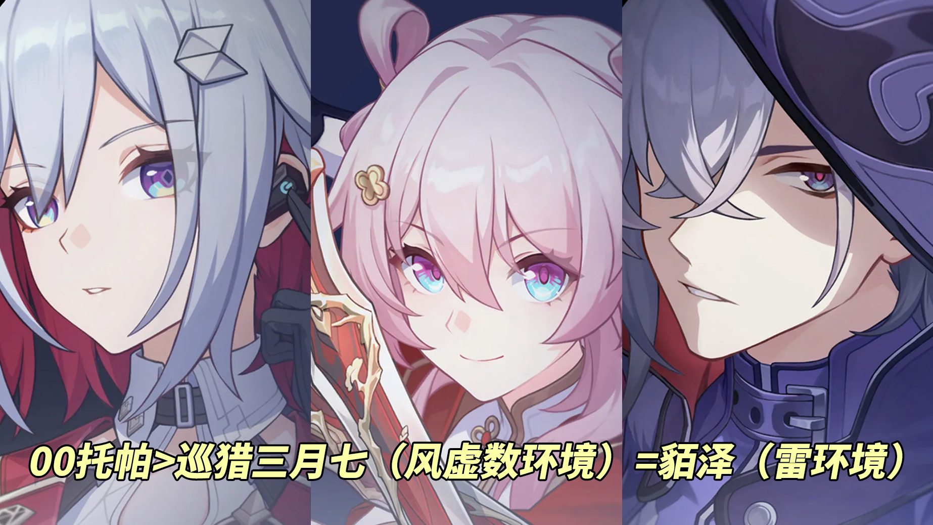 【二号位】搭配可辅可C角色,00托帕>巡猎三月七(风虚数环境)=貊泽(雷环境)。差距非常小,有托帕就用,若无不值得单独加1金。