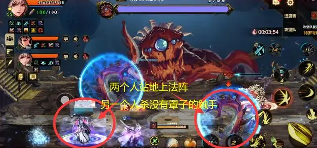 触手法阵:机制期间地图会召唤2个法阵+2个带防护罩的章鱼触手,此时需要2名队友同时站在同一法阵上,剩下那名队友及时击杀没有了防护罩的触手,循环两次击杀全部触手(如果击杀不及时会直接炸团!)。