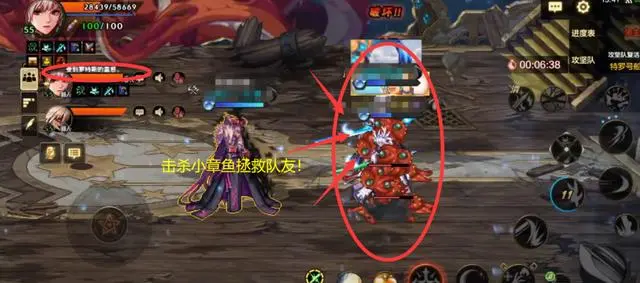 小怪捆绑:罗特斯喊话“快点献出你们愚蠢的灵魂吧”,队伍两人会被小章鱼捆绑控制,剩下一个人及时击杀小章鱼救出队友。