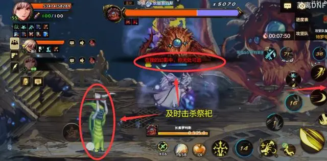 幻影祭祀:罗特斯击退玩家,喊话“在我的幻影中,你无处可逃”,会在地图两边各召唤一名祭祀,需要及时击杀(击杀祭祀时注意躲避脚下黄圈)。