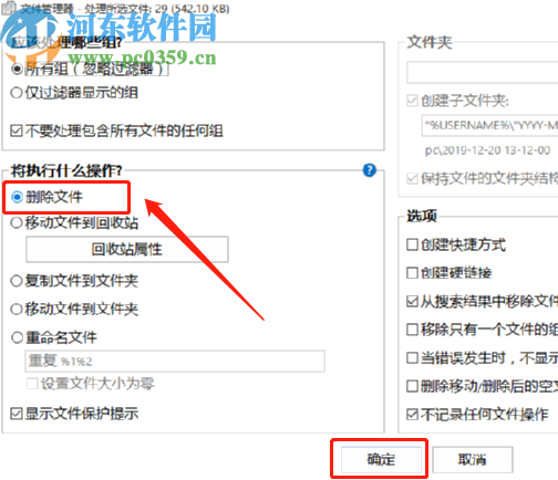 5.紧接着下一步就会进入到选中文件的处理界面了,在其中我们选择删除文件这个功能选项并点击下方的确定按钮即可将它们删除。