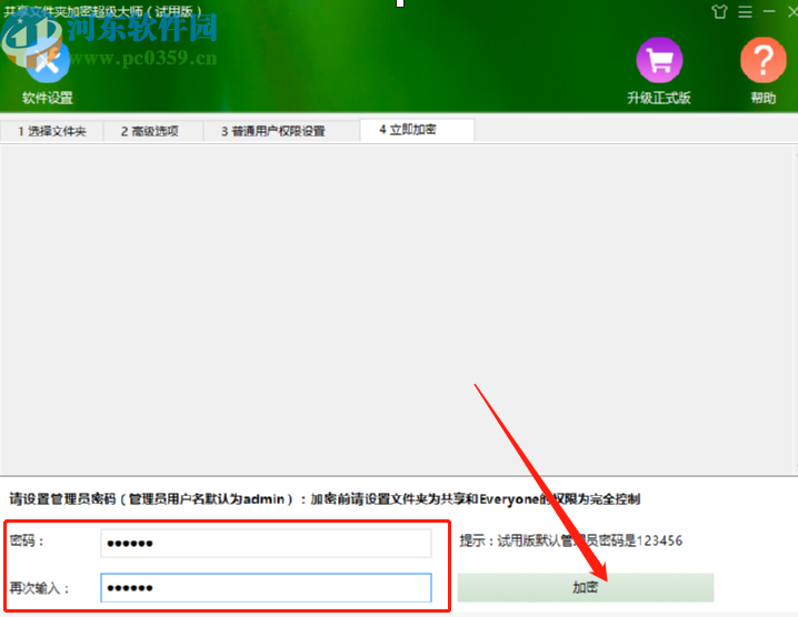 5.最后设置好查看权限,我们切换到立即加密功能模块,然后点击输入加密的密码,输入完成之后点击加密按钮就可以进行加密了。