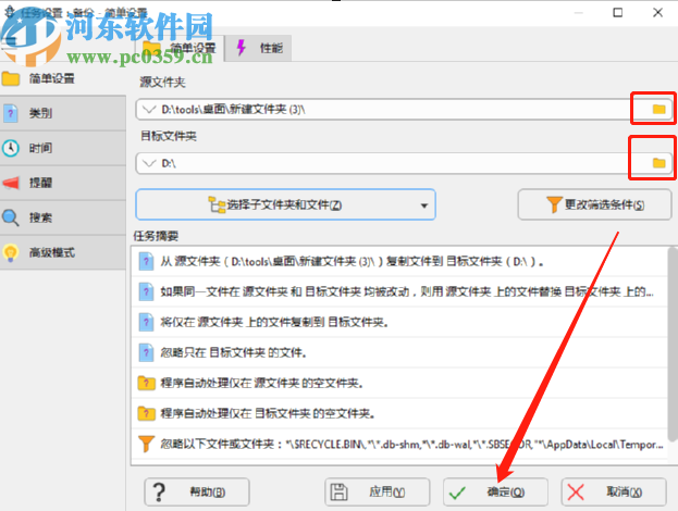 4.点击完成按钮之后会来到设置备份任务的界面,在这个界面中我们点击源文件夹和目标文件夹后面的文件夹图标可以选择需要备份的文件和备份到那个文件位置中,选择完成之后点击确定按钮。