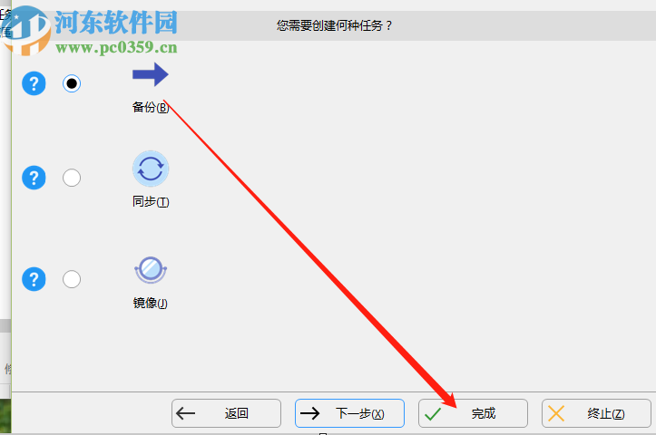 3.下一步就是进入到下图所示的界面了,我们需要在界面中选择要创建什么任务,我们选择备份之后直接点击完成按钮即可。