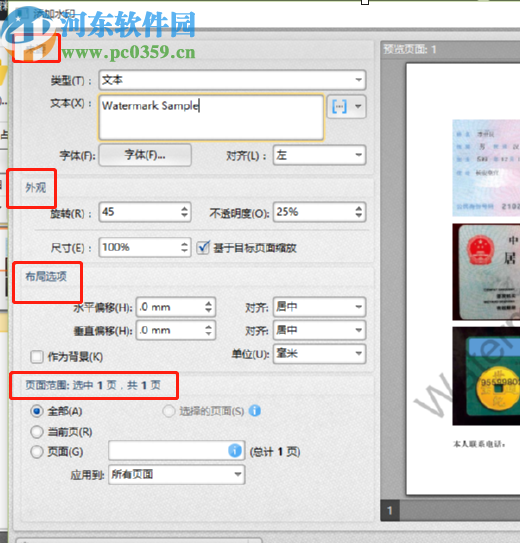 4.点击添加按钮之后就来到编辑水印的界面了,我们选择文本水印之后在文本输入框中输入文本的内容,然后对水印的外观、布局选项和页面范围这些选项进行设置,根据用户对水印的需求设置即可。