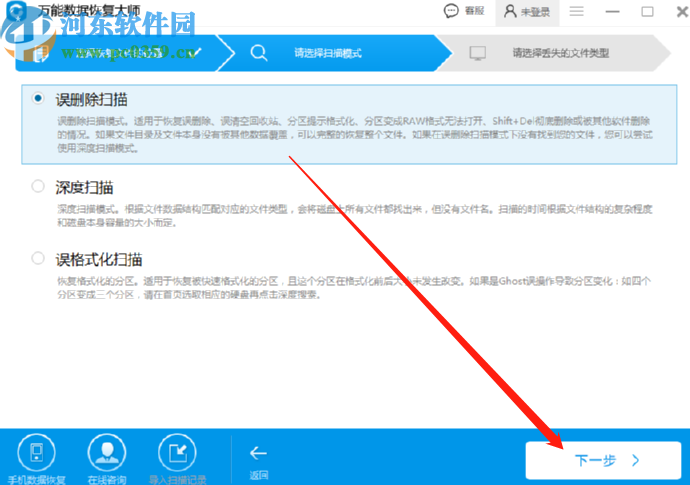2.点击下一步按钮之后紧接着是需要选择要使用的扫描模式,恢复误删文件的话就点击选中误删除扫描这个扫描模式,然后点击右下角的下一步按钮。