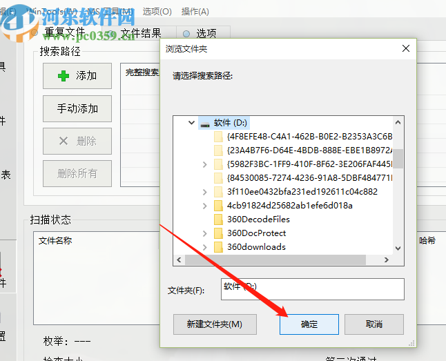 2.点击这个添加按钮之后紧接着会出现一个选择浏览文件夹的界面,在这个界面中我们选择好要扫描重复文件的磁盘之后点击确定按钮。