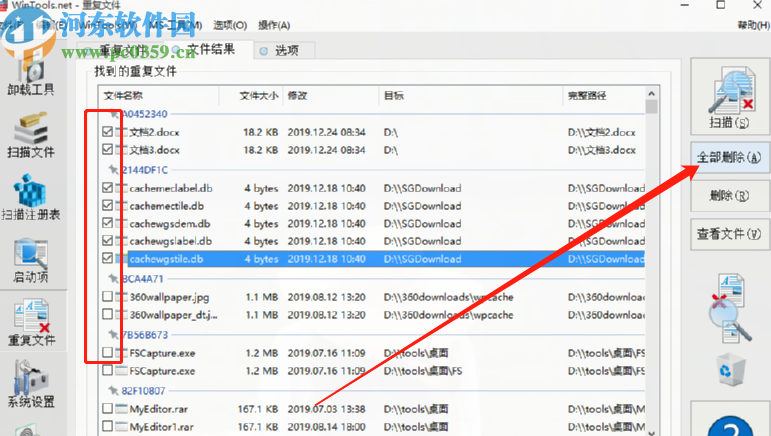 5.最后一步我们只需要在这些重复文件中找到自己想要删除的重复文件,勾选之后点击删除即可,也可以直接点击全部删除按钮将它们全部清除掉。