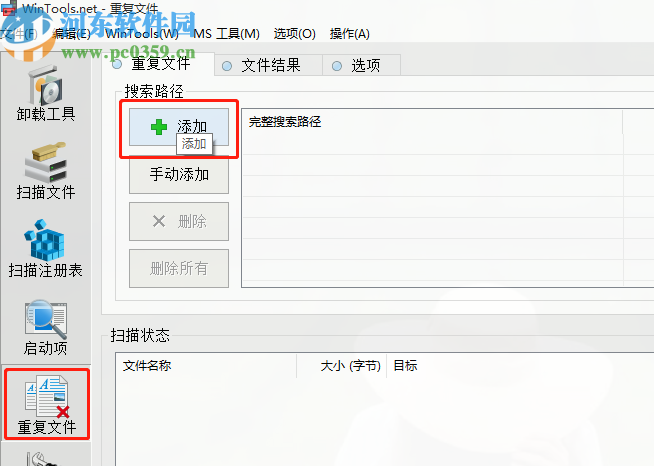 1.首先第一步我们打开软件之后在软件的左边界面中点击切换到重复文件这个功能界面,然后在重复文件中点击添加按钮。