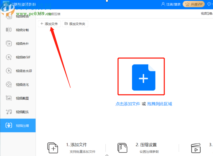 2.点击进入到视频压缩功能界面之后,下一步我们在界面中点击添加文件按钮,或者是点击加号来准备添加要压缩的视频文件。