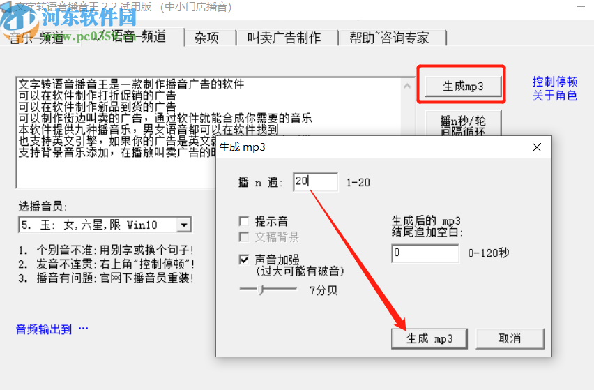 4.调节好语音参数之后,下一步就是点击界面中的生成MP3这个功能按钮,然后在出现的界面中设置重复播放的次数,再次点击生成MP3按钮。