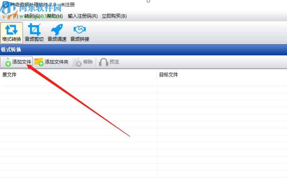 1.首先第一步我们打开软件之后在软件的主界面中需要点击添加文件这个功能按钮。点击添加文件之后添加要进行转换操作的音频文件。